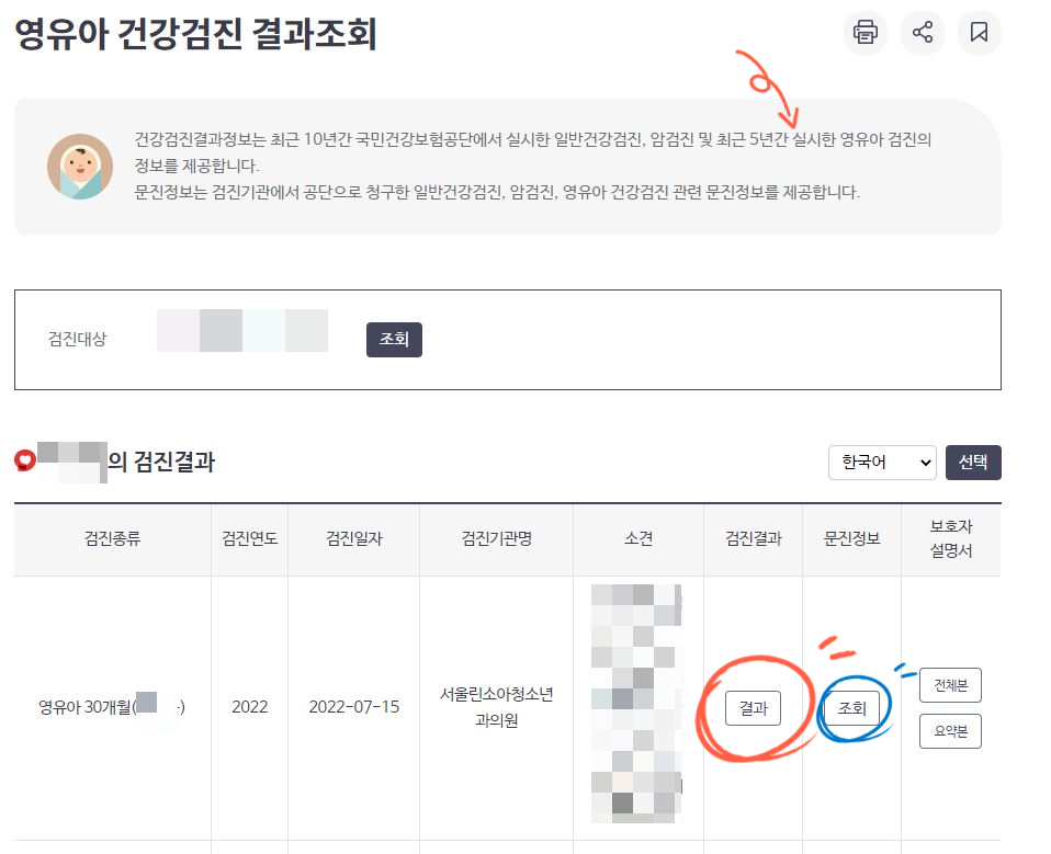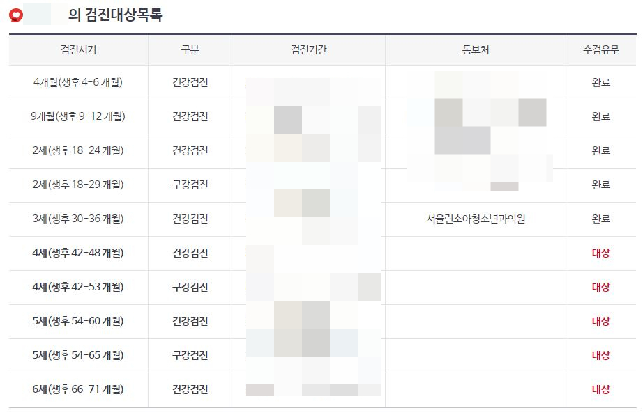 현재까지 받았던 영유아 검진 내역이 뜬다.(최근 5년간 실시한 것만 뜬다고 되어있다.)
