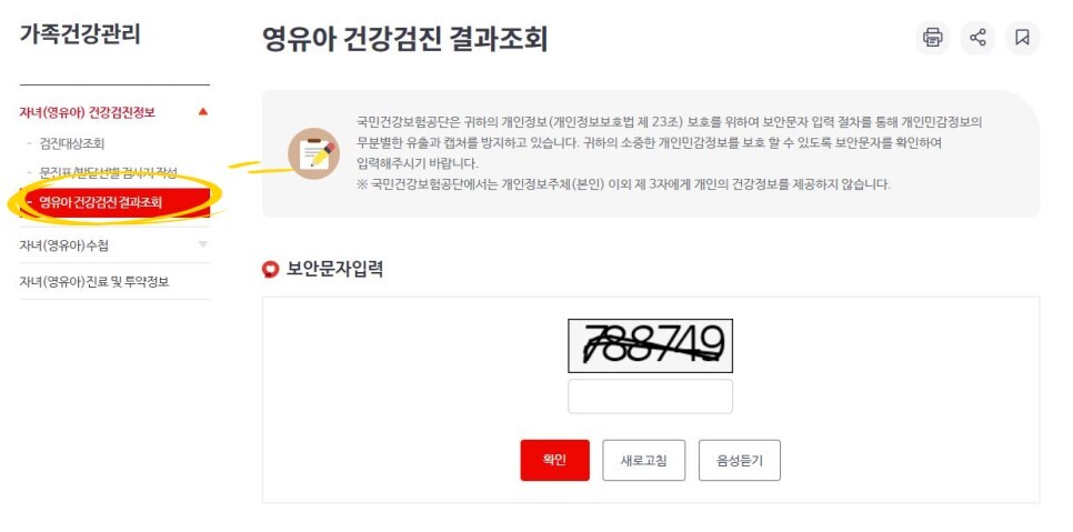 가족건강관리> 자녀(영유아)건강검진정보> 검진대상조회 클릭(검은색동그라미)